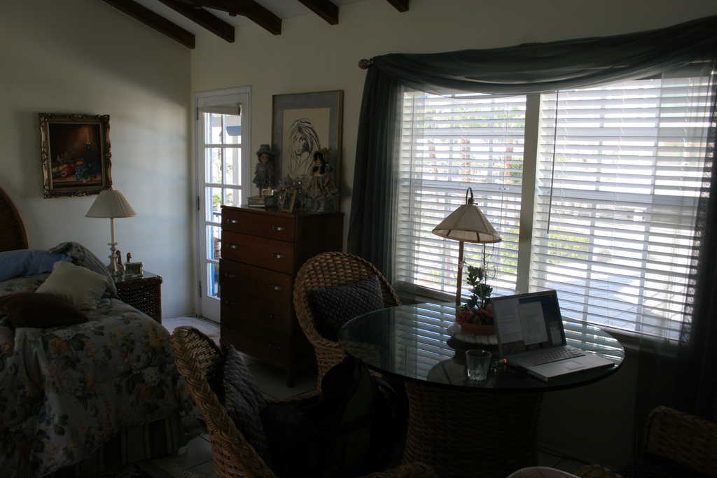 My laptop on the table is using my new Verizon BroadbandAccess card, giving me megabit speeds over the cell network at a fixed monthly rate. Sweet.